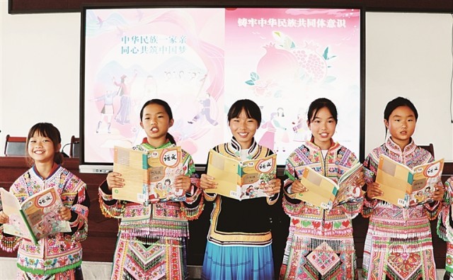 贵州省毕节市黔西市铁石苗乡彝乡铁石小学的同学们用国家通用语言朗读课文。熊万军摄/光明图片