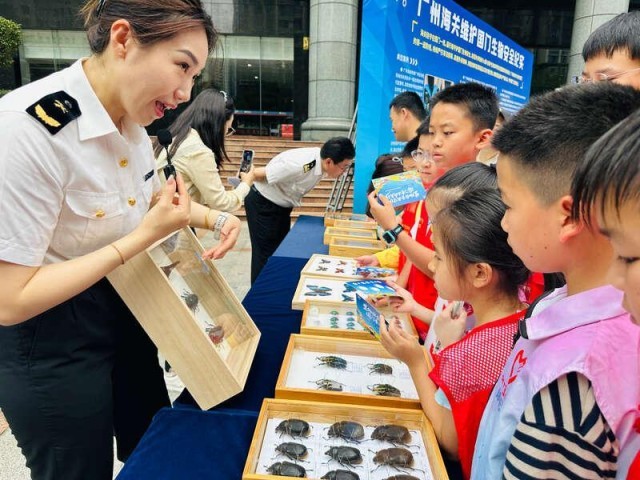 “这只手掌大的甲虫,中文名叫长戟犀金龟,主要分布于中南美洲的热带雨林,是世界上最大的甲虫之一,目前在我国尚无自然分布,属于外来物种。如果它们扩散至野外,会因为缺少天敌制约,挤占本地物种的生存空间,从而可能导致本地物种减少,使本地生态系统受到冲击。”在外来物种展示区,广州海关技术中心工作人员为小朋友们讲解外来物种给国家生态安全带来的影响。
